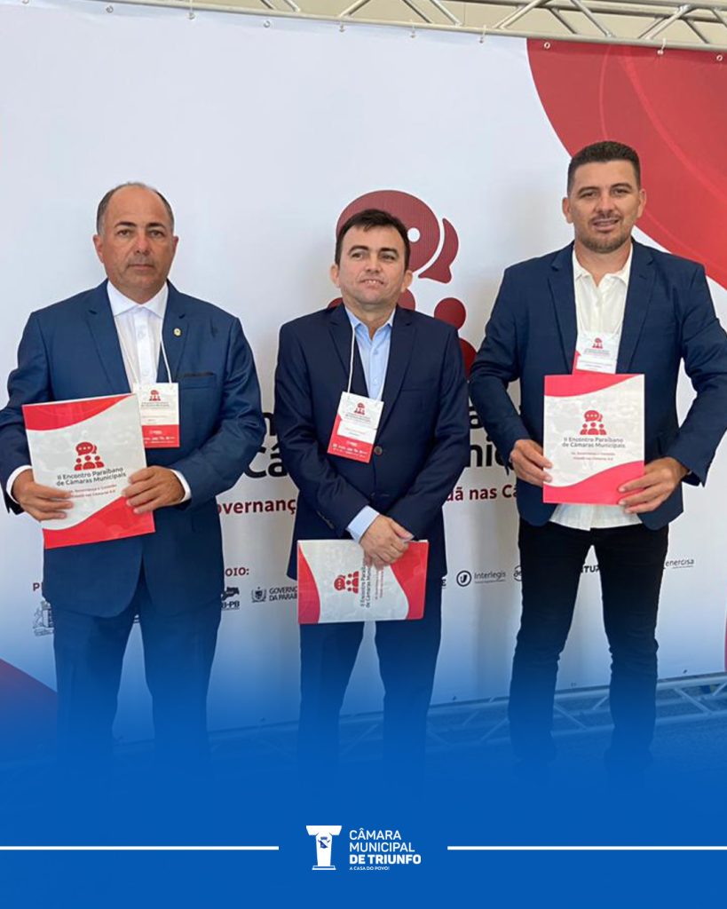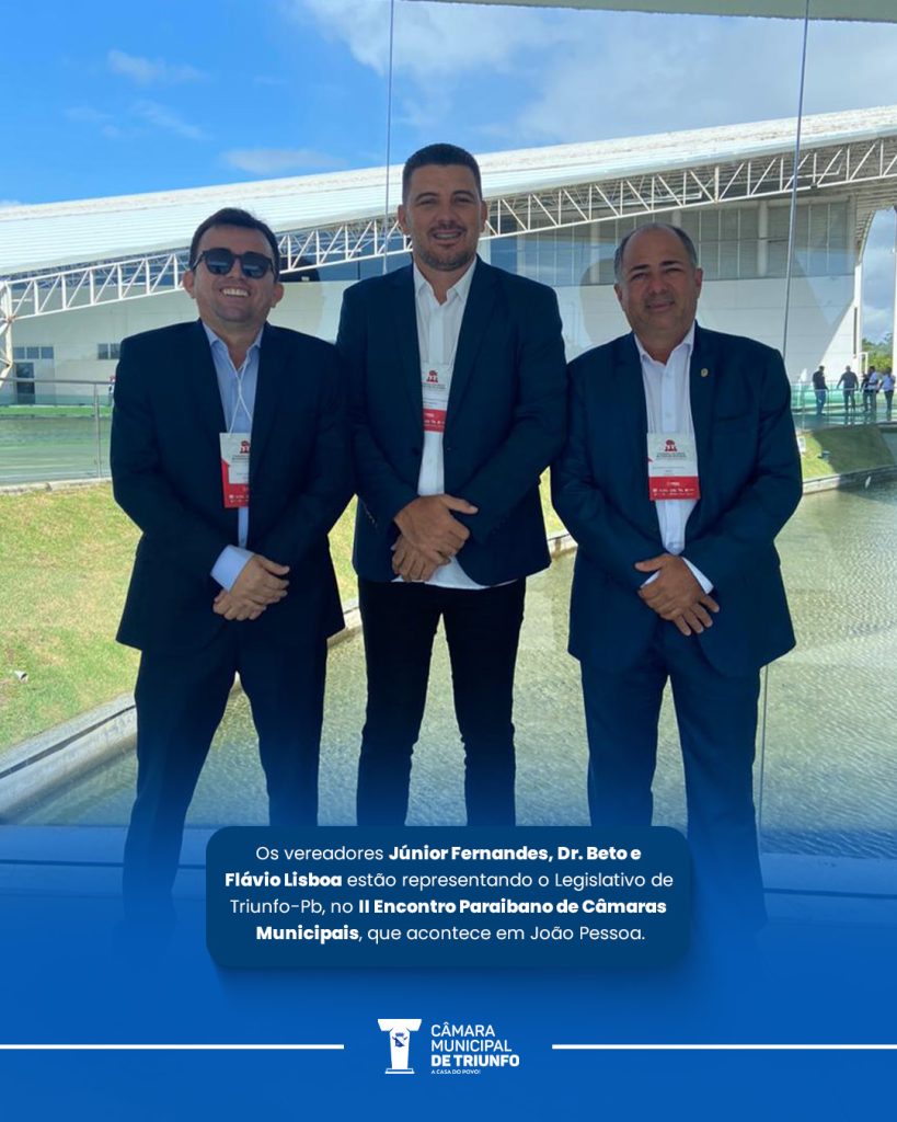30/05/2025 - 16:47h - Eventos / NotíciasOs vereadores Francisco Júnior Fernandes de Almeida, José Alberto Cartaxo Feitosa e Flávio Lisboa Nóbrega representaram o Poder Legislativo do município de Triunfo-PB no II Encontro Paraibano de Câmaras Municipais, realizado na capital do Estado, João Pessoa. O evento reuniu parlamentares de diversas regiões da Paraíba com o propósito de promover o debate sobre os desafios contemporâneos da administração legislativa e o aprimoramento das práticas públicas.